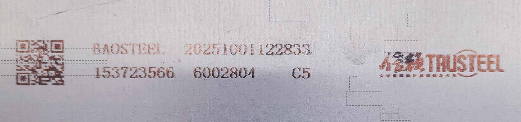 宝钢彩涂板二维码防伪标记在每个钢卷背面,可能出现在钢板背面的左侧,也可能出现在钢卷背面的右侧,是随机的;标记在距离带钢边部约5厘米的位置,纵向排列,间距约2米;每个二维码旁边会有BAOSTEEL、母卷号、宝钢上表面精涂涂料代码和打印时间。打印标记不仅每个二维码不同,每个二维码旁边打印时间也是不同的(精确到秒)。上述特征即可肉眼初步辨别钢卷真伪。